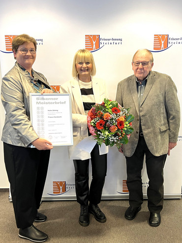 Heike Dellwig aus Neuenkirchen hat vor 25 Jahren ihre Meisterprüfung im Friseurhandwerk abgelegt und erhielt aus den Händen von ihrem ehemaligen Ausbilder und früheren Obermeister Horst Lauscher den Silbernen Meistbrief. Obermeisterin Susanne Dorsten…