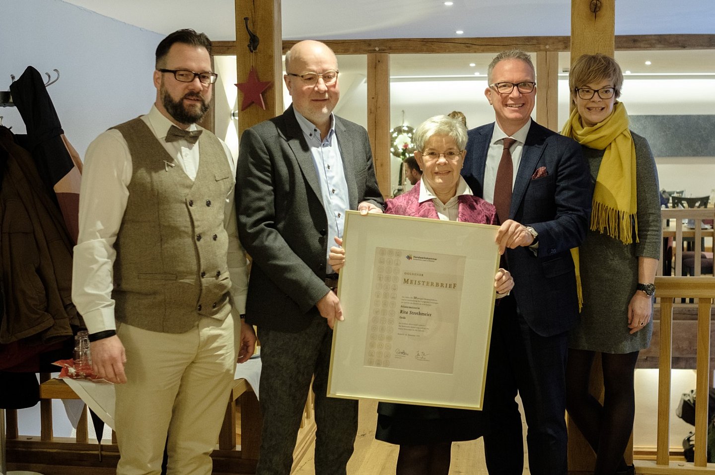 Am Sonntag, den 16. Dezember 2018, überreichte die Friseur-Innung Warendorf, vertreten durch Herrn Obermeister Ulrich Saamen, gemeinsam mit Herrn Frank Tischner, Hauptgeschäftsführer der Kreishandwerkerschaft Steinfurt-Warendorf, den Goldenen Meisterbrief an Friseurmeisterin Rita Strothmeier aus Stromberg.