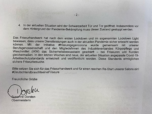 Mit heutigem Datum hat die Friseur-Innung Steinfurt ihre hiesigen Bundes- und Landstagsabgeortneten angeschrieben, mit der Bitte, sich für einen schnellen Re-Start unserer Friseure einzusetzen.